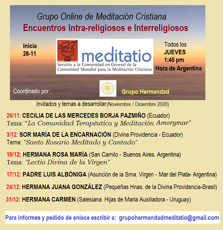 Desde el área de “Diálogo Ecuménico e Interreligioso” de Meditatio Argentina, daremos inicio a un nuevo grupo de meditación online a través de Zoom. Sigue leyendo.