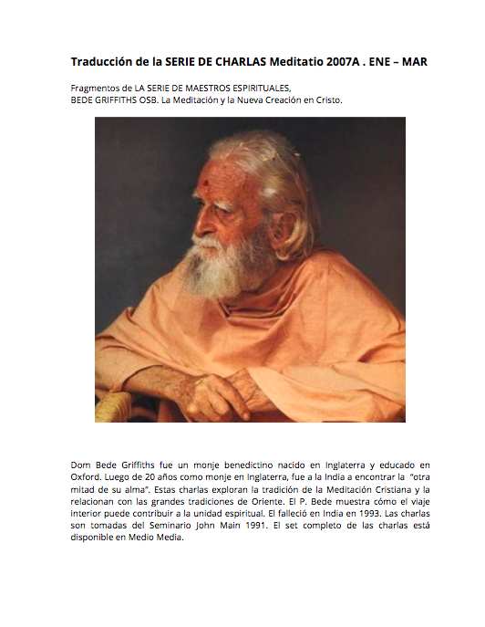 ► Dom ​​Bede Griffiths fue un monje benedictino inglés educado en Oxford. Luego de 20 años como monje en Inglaterra, fue a la India a encontrar la “otra mitad de su alma”. Estas charlas exploran la tradición de la Meditación Cristiana y la relacionan con las grandes tradiciones de Oriente, mostrando cómo el viaje interior puede contribuir a la unidad espiritual. El falleció en India en 1993. Las charlas son tomadas del Seminario John Main 1991.